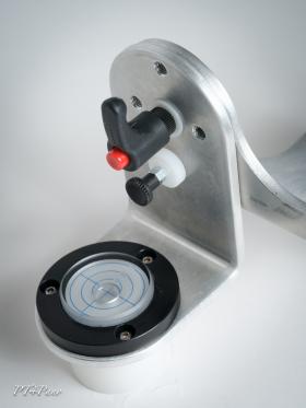Für die Nivellierung des Vertico verwende ich gerne eine Nivellierplatte, keinen Kugelkopf, und eine große, empfindliche Dosenlibelle. Daher habe ich den Prototypen mit einer großen Libelle aus deutscher Fertigung ausgestattet. Darunter sitzt das 3/8" Stativgewinde. Die Stabilität und die kompakten Abmessungen gewährleisten extrem kurze Schenkel des Setups.